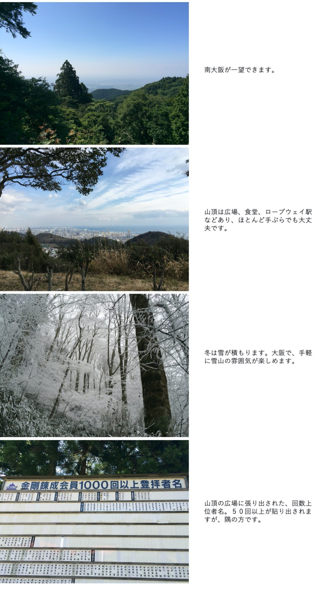 特徴的なのは、山頂に売っている回数カードというものを買えば、登頂すると、スタンプを押してもらえます。50回以上登ると公園のボードに名前をあげてもらえます。私はいろいろな山に行きたいタイプなので、挑戦していませんが、1万回以上登っている人が、数人おられます。今は、一日一個しか押してくれないので、毎日登っても365個。1万回、、、すごいですね。山頂で休んでいると、「おお、昨日こんかったなぁ」とか、「あいつ、最近みいひんな」とか常連さんの会話があちこちで聞かれます。