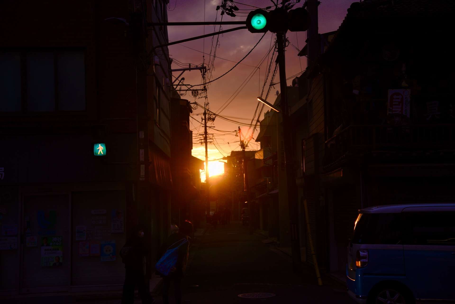 京都散歩の帰り道。道路の隙間からのぞく夕陽。今の実力笑。目標は夕陽と夕陽時間の綺麗な写真。難しそうですけど笑。