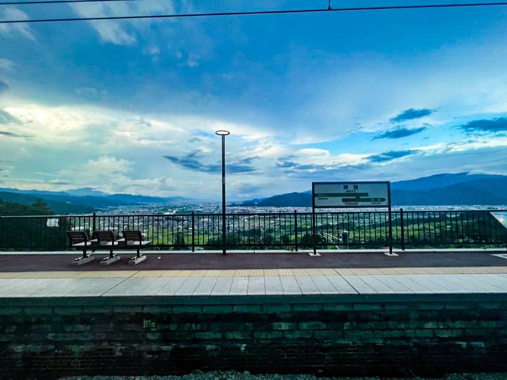 車窓はこんな感じ。善光寺平が一望できとてもいい感じです。一見恐ろしく感じる駅名も実は昔話があるようです。老人が嫌いな殿様が70以上の者は山に捨てるようにとのおふれを出しました。ところがある若者は母親を捨てきれず匿いました。あるとき国の難題がのしかかったとき、おばあちゃんの知恵がその難題を解決。褒美を取らせようとした殿様に若者がネタバラシ。それで殿様は改心し老人を大切にするようになった、という昔話があるようです。