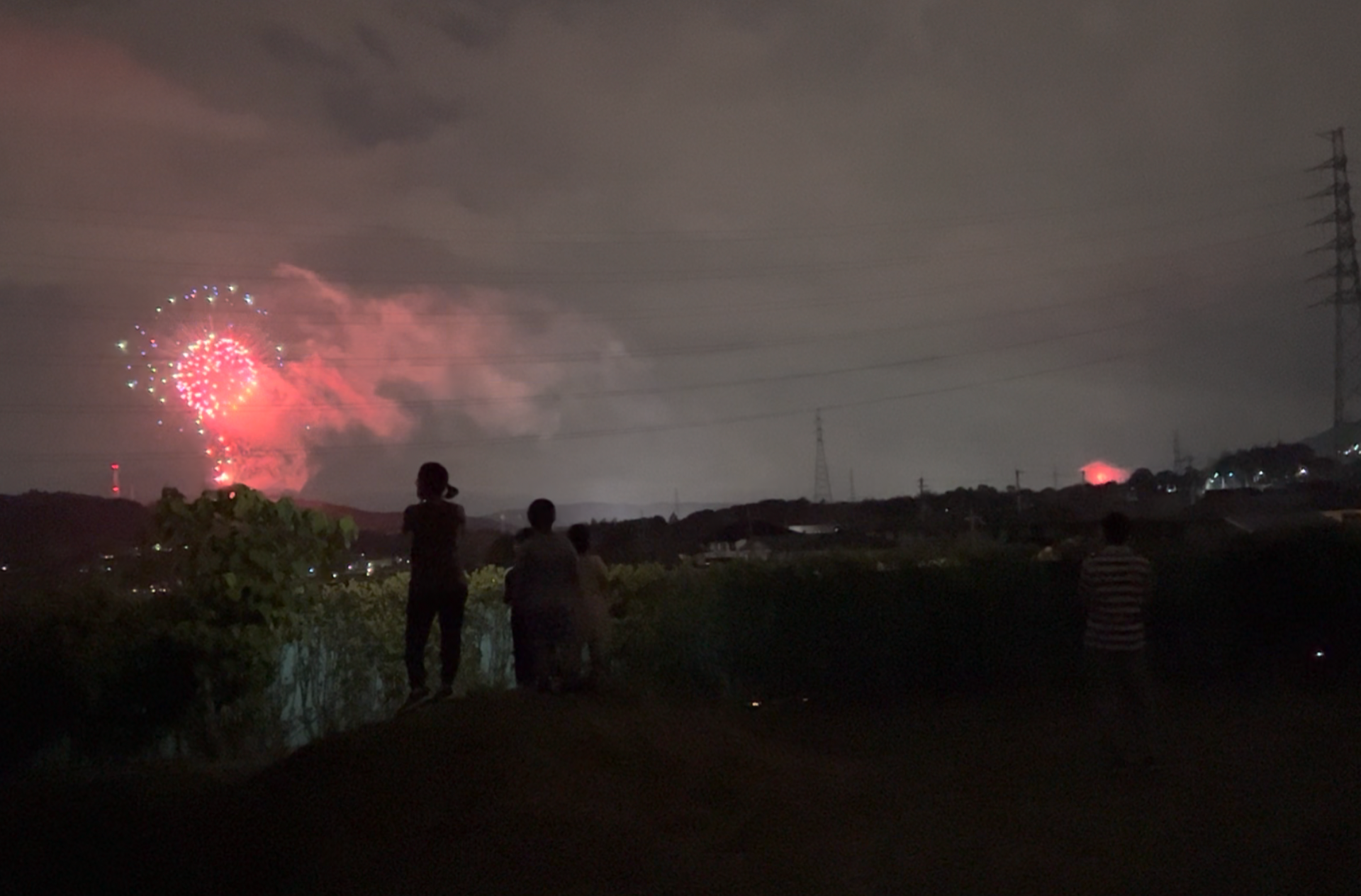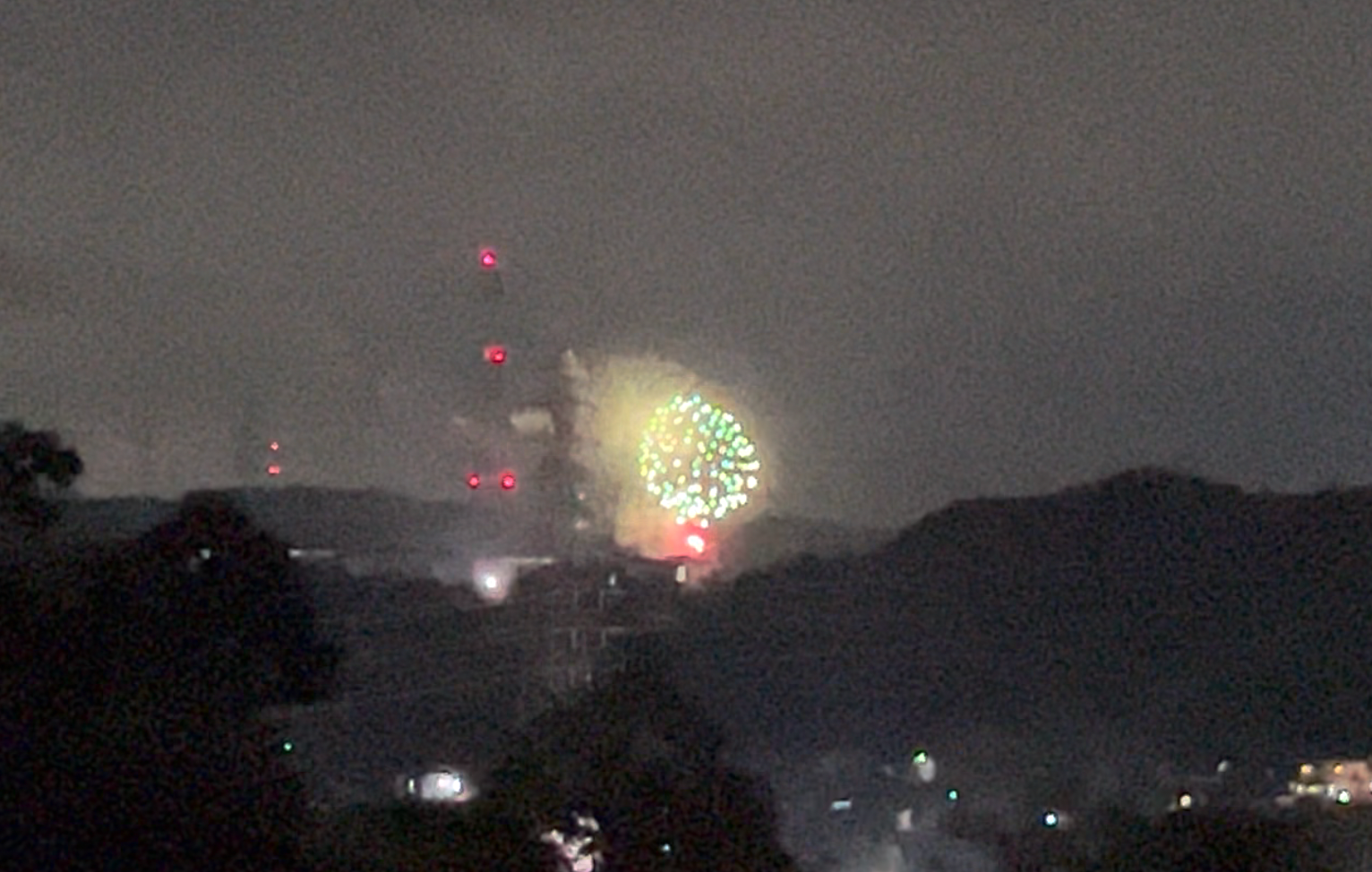 自宅で事務処理をしていると、どーーーん、どーーーんと花火を上げる音が聞こえました。去年も見えたので同じ場所へ。試射だったらしく、行くと何も上がってませんでしたが、近所の人が椅子持ってきてて「8時からやでー」と教えてくれたので、事務処理を整理して8時に見に行きました(そこの場所まであるいて2分くらい笑)。去年と同じ場所で上がってました。あーきれいやなーって思っていたらなんか横の方でもどーんどーーん。反響してるなーって思ってふとみると、あれ、横方向でも上がっています。おおおおおーって思っていたら、先の場所の奥っ側でも上がっています。おおおおおおおって思ってあっちもこっちもみていたら、あれ?同じ花火が別々の場所であがってる、、、ほんまかいなと思ってパッパってあっちみてこっちみて。そしたらやはり同じ。へーめずらしーって思ったら今度はこのレアを動画に撮りたくなって笑。去年は結構長いことやってたなーって思ってたんで、なんとかこの3ヶ所同時同花火を動画にのこしたかったのですが、どうしても横方向の花火は画角に収まらず(そらそうなんだけど笑)。悪戦苦闘してるうちに今年は15分でおしまいってことで、あまりじっくり花火をみてないー笑。おなじ花火師さんの15分コースだったんですかねー笑。一歩も動かず、3ヶ所同時の同花火。レアでしょう笑。