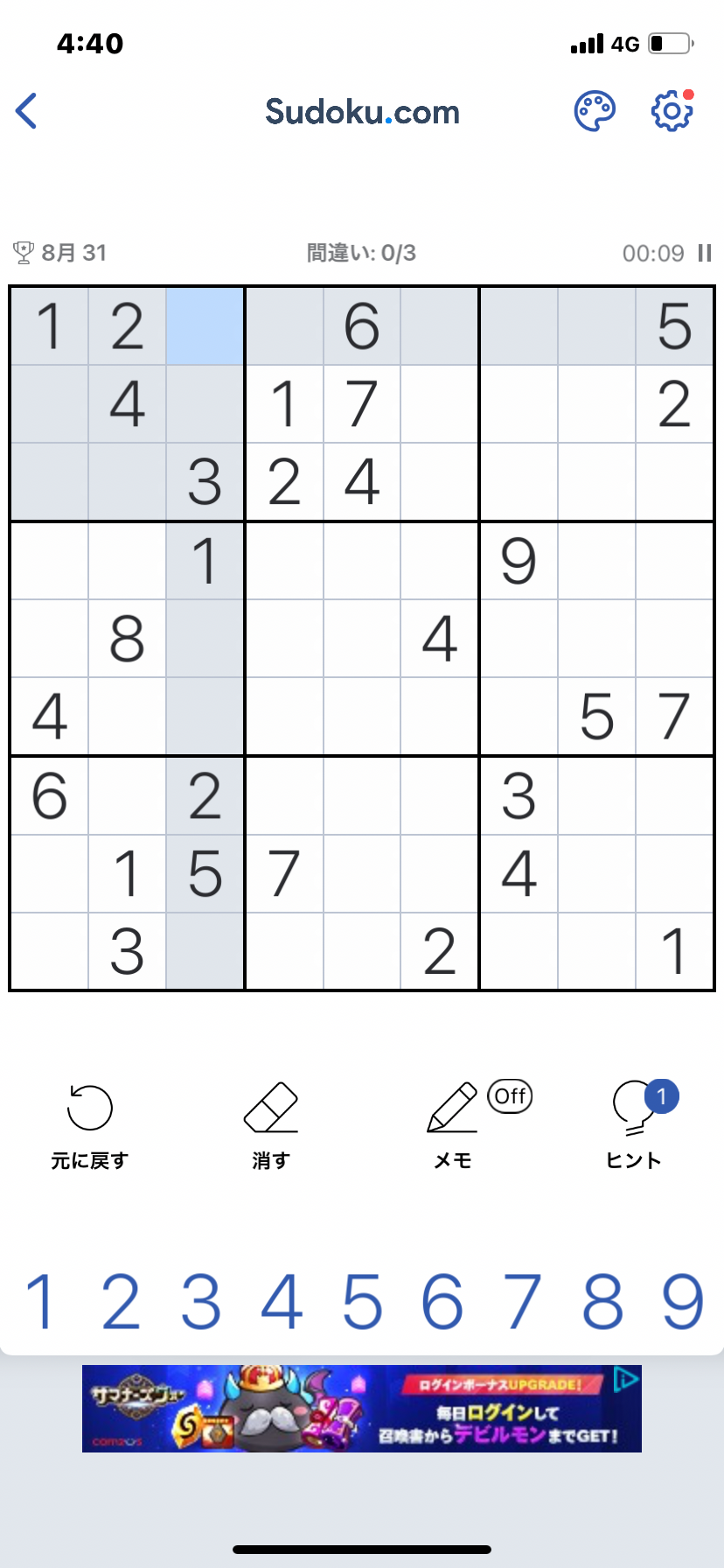 9x9=81のマスがあっていくつか数字がでてます。写真の状態で出題されてます。縦方向にも横方向にも同じ数字をかさねることができず、3x3のブロック内も同じ数字を入れれない、というのがルールです。