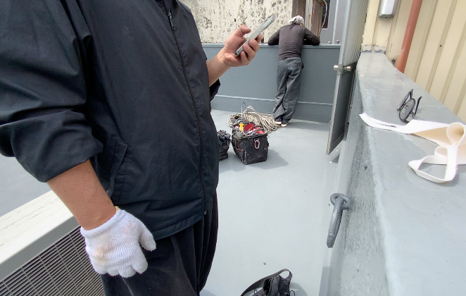私たちにとって軍手は必需品です。手を保護するのはもちろん、降下点から屋上への動線上、ドアを開けたりエレベーターに乗らせていただいたりなど、汚してはならないところを、汚れた手で触ることはできませんから、そういった意味でも必需品です。ただ、スマホの機能が増えるに従って、スマホも必需品になりつつあります。電話はもちろん写真や動画撮影など、ぱっと操作がしたいときがありますが、軍手をしていると、なかなかぱっとができません。作業中はそうした、ぱっと、がありませんし、室内を通るわけではないので軍手でいいのですが、現調時などは軍手をしたままスマホがいじれたらいいな、って思います。