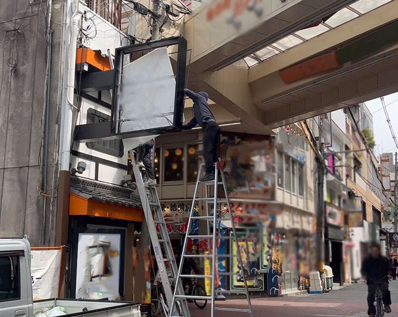 私たちがよく聞かれることのひとつに「こわないの?」というのがありますが、高いところが怖い怖くないは個人差なのでなんとも言いづらいのですが、実はロープ作業は意外と安心感があります。要はロープを信じれるか信じられないかですが、一旦体重をかけてしまうと、安定感、安心感はあります。すこし引っ張られる感こそありますが、座っているのとあまり変わりません。写真のようにスライダーや脚立のほうが私たちにとっては怖いです。グラグラしてるとはいいませんが、脚立がたおれたら?とか色々こわい。この高さだと落ちれば良くて大怪我です。足場も意外と隙間が多いので、やはりどっちかというとロープが一番怖くない。感じ方はさまざまですので一概にはいえませんが個人の見解ではです笑。