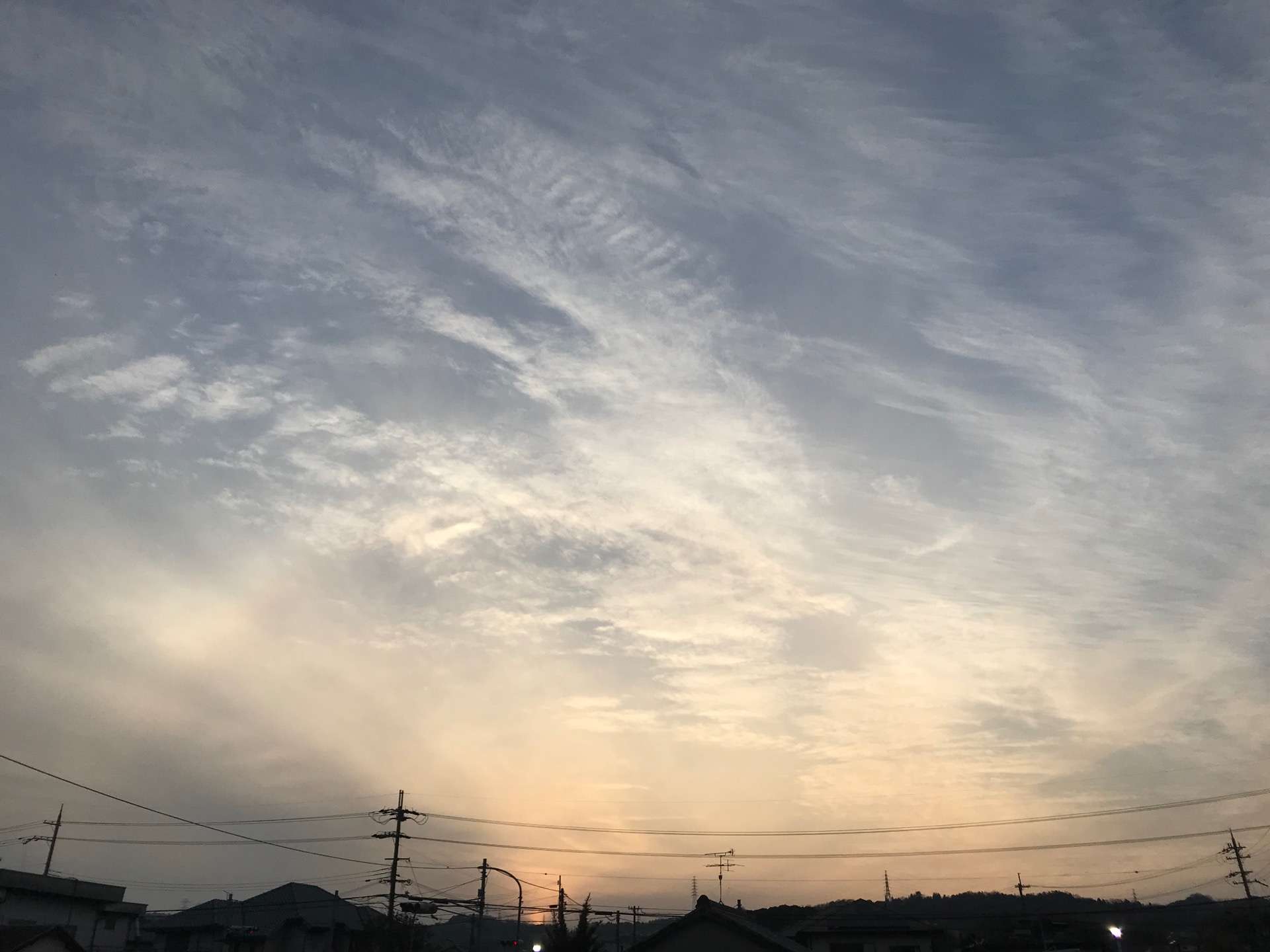 立春後は少し暖か目。今日は夕陽のハロの大阪 2021/02/11 綺麗な空。雨のサインですが、、夕陽のハロです ハロは、雲の中にある氷の粒に太陽の光が屈折してできる現象でうす~い雲が太陽にかかった時に見える虹の輪。ハロが見られるときは下り坂のサインといわれており、低気圧や前線が接近して天気が崩れる前触れです。うっすら半円で見えました。夕陽もはっきり見えずなが〜く伸び筆で伸ばしたような雲といかにも雨の予兆のような空でしたが、とても綺麗でした。 ◉◉◉ 個人ブログ ◉◉◉== 観光・行楽 日常 好きなことetc ==