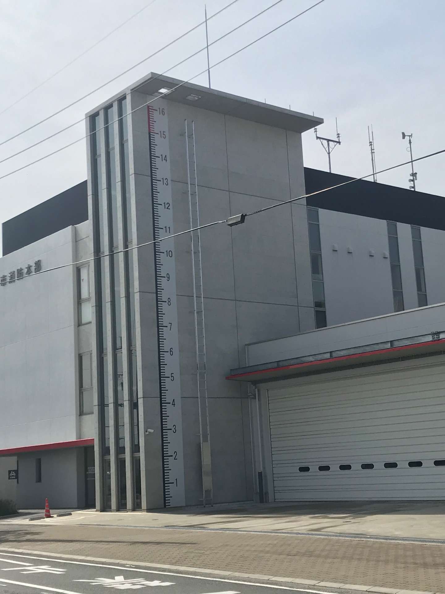消防署の壁に高さの表記。なんのためか調べてみましたが、よくわかりませんでした(汗)