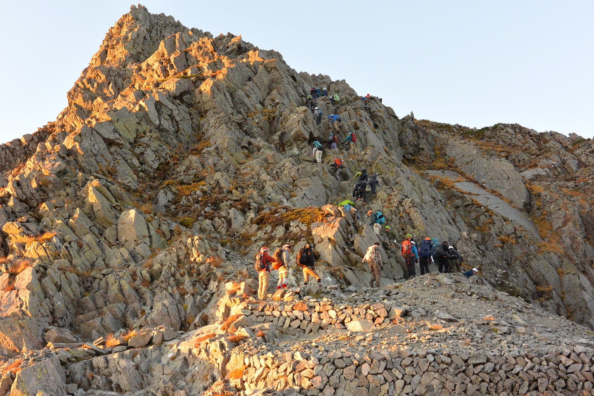 山の入門書などには、すれ違い時は登り優先で、と、書かれているものが多いように思います。登っているとあまり前を見ずにズンズン降ってこられる方もおられますし、ほっと一息つきたいので待ちたい時もありますので、私はあまり登り優先にはこだわっていません。大事なのは登りでも降りでも、待つときは山側ということだと思います。万が一接触した時に待っている方は不意をつかれるので、谷側で待つと落ちる可能性があるからです。常識だよ、と、言われるかもしれませんが、結構谷側で待たれることが多い気がするします。谷側で待つと誤解しているのではなく、意識しておられないのだと思います。いかにも危険なところはもちろんですが、接触しなさそうなすれ違いや、落ちてもどういったことのなさそうな場所でも、癖つけるように谷側で待たれる方がいたら、道を譲って山側で待つようにしています。