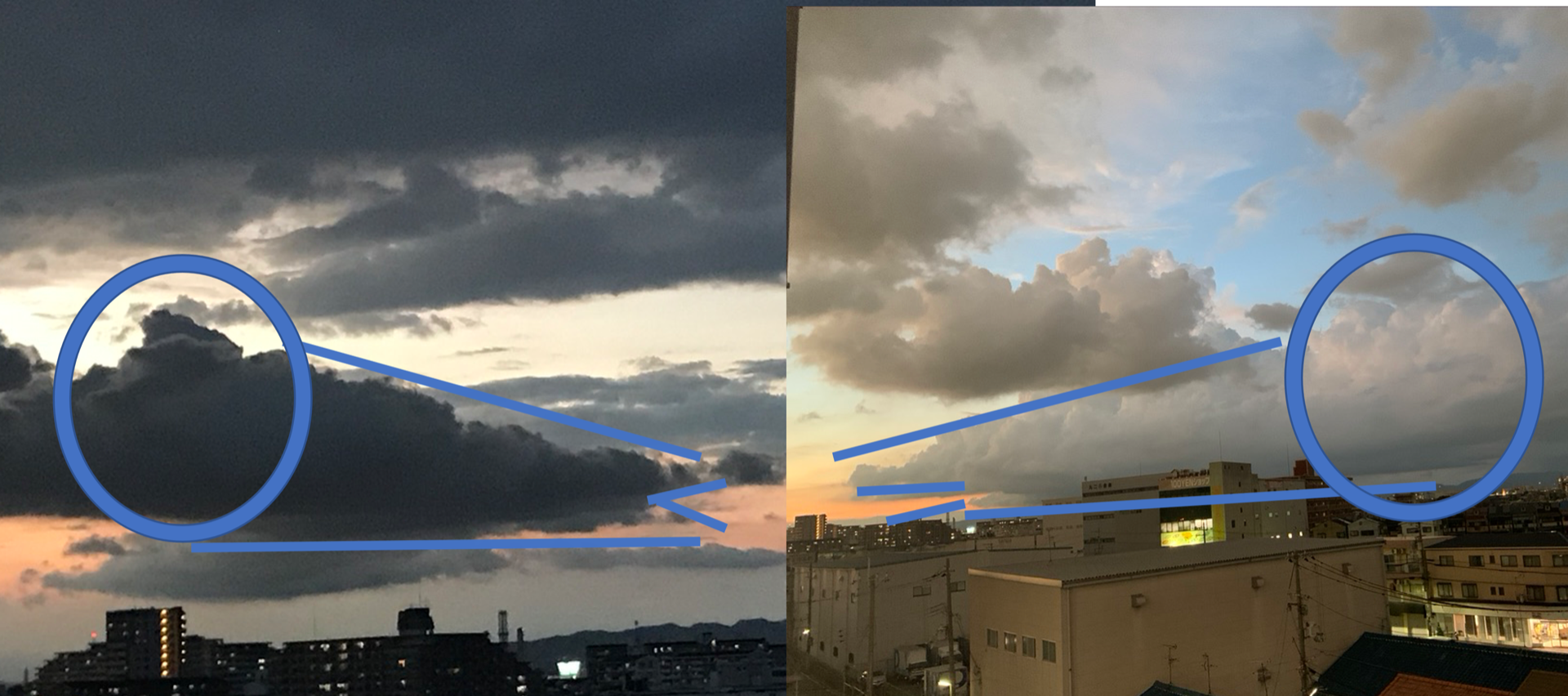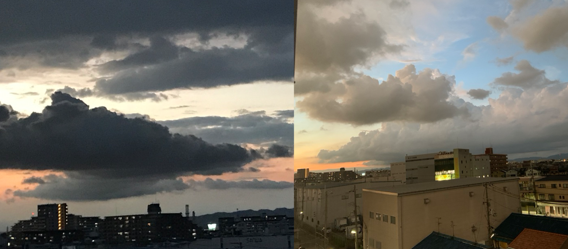 そしたら、次の日、昨日です。同じ場所でちょっと方向が違うのですが、ちょうど左右対象に昨日のくもがそこにあればちょうど向かい合う形で白黒反転の似たような形の雲が!!と、、おもったのですが、それで写真をパシャリとやったのですが、、こうしてならべてみると、微妙にも見える。。