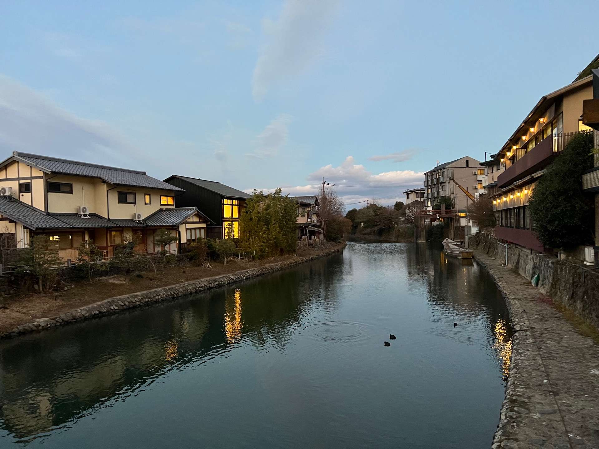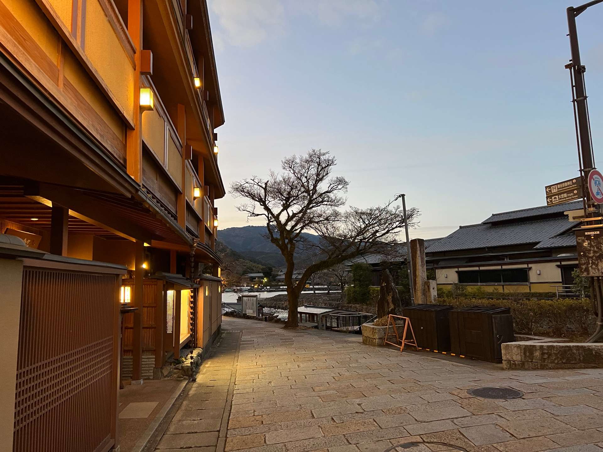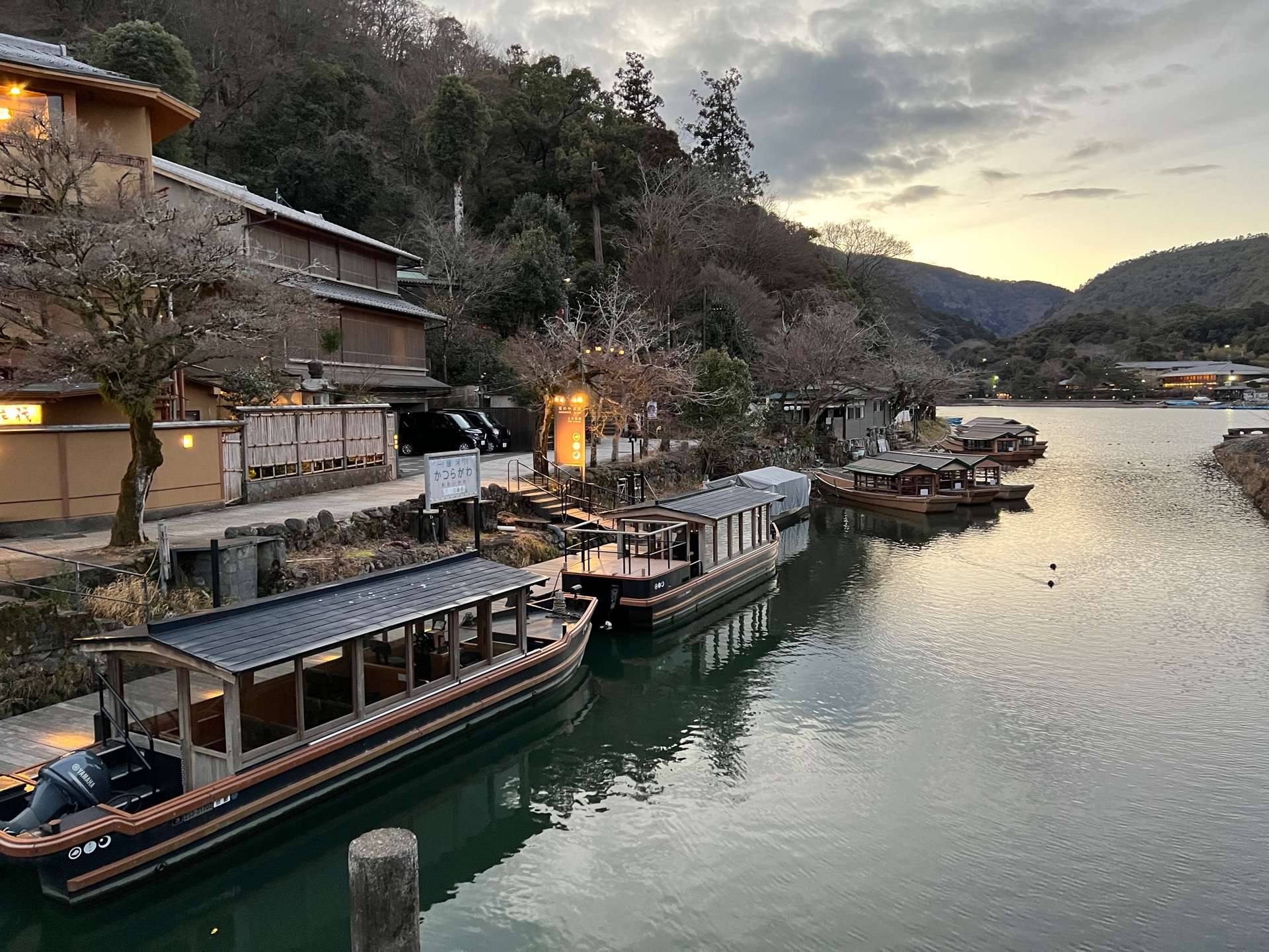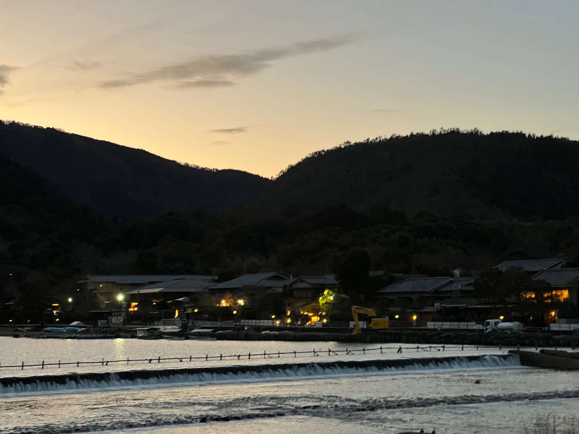 ほとんどの観光地はそう何回もいくものではありませんので、ある時間帯しか知りません。でも、近くの観光地で何回も行くような場所は、いろんな時間帯に訪れますので、ああ、ここのこの時間帯、好きだなーって思う時があります。学生時代から嵐山はよくいきますから、あさから晩、それこそ夜中まで何回も行ってます。そのなかで好きなのは夕暮れ時。夕陽が見えるわけではないのですが、店が閉まり、旅館の灯りが灯り始める時間帯。賑わっていた人々がいなくなる時間。にぎわいから落ち着いた雰囲気を味わえる一瞬と残照。京都、嵐山はこの時間帯が好きです。