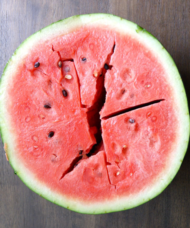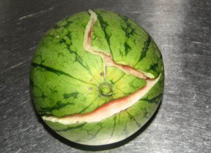 問題はこれです。皮を破壊するまでの振動ではないが、ある程度の振動をすいかに与えてしまうと、割った時にこのように中が割れています。すいかをスーパーで買って持って帰る時、振動など衝撃を与えないようにしますよね。でも、ゴロンゴロンして、割ってみたらこんなん、ってご経験がありませんか。