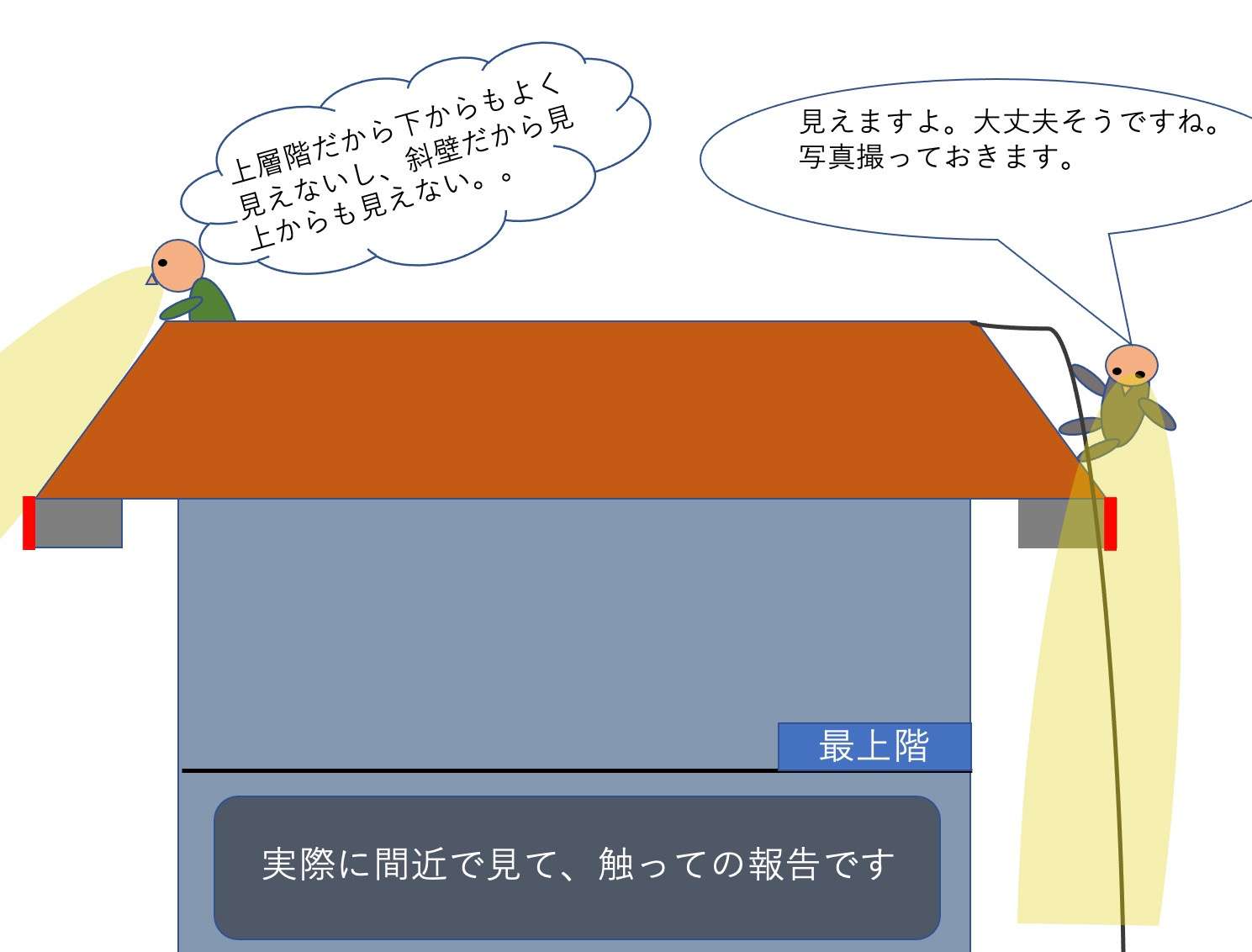 斜壁と外壁の取り合いは、屋上からだと死角になり、地上からだと最上階になるので、足がつくところからの確認は困難な部位になります。階層が増えればより困難になります。状況が全くわからない場合も少なくありませんが、ロープを使えばいつでも間近にみることができます。