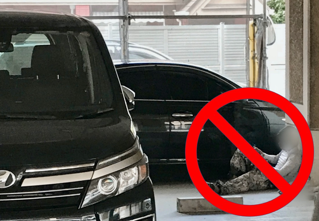 穂高外装メンテナンスLLC.では職人の現場及び、現場周辺での座り込み、たむろを禁止しています。側で見ていて気持ちの良いものではないですし、通行の邪魔など、周辺に迷惑をかけている場合も見かけます。休憩は屋上のネタ場周辺で取ります。移動車でとる場合もあります。いずれにしても涼しいからと言って、住民の方が使用している駐車場や、エントランス周り、共用廊下などで、寝そべったり、喫煙したり、たむろしたり、と、いうのは住民や、建物の使用者から見ていて実害の有無ではなく、気持ちいいものではないと思います。工事業者は知らず知らずに迷惑をかけがちなのに、通行時にかえって住民の方に気を使わせたり、威圧感さえ与える、座り込みをする業者などを見かけることがあります。エレベーターを使うのに、当然住民の方優先ですが、それすら配慮できない職人も見かけることがあります。