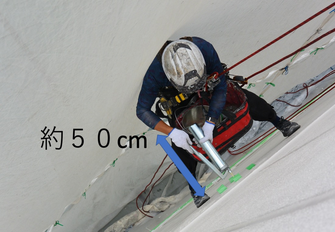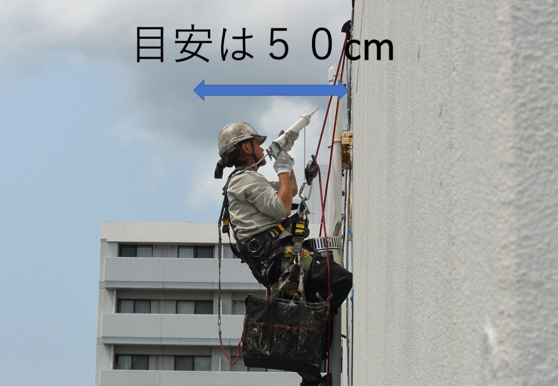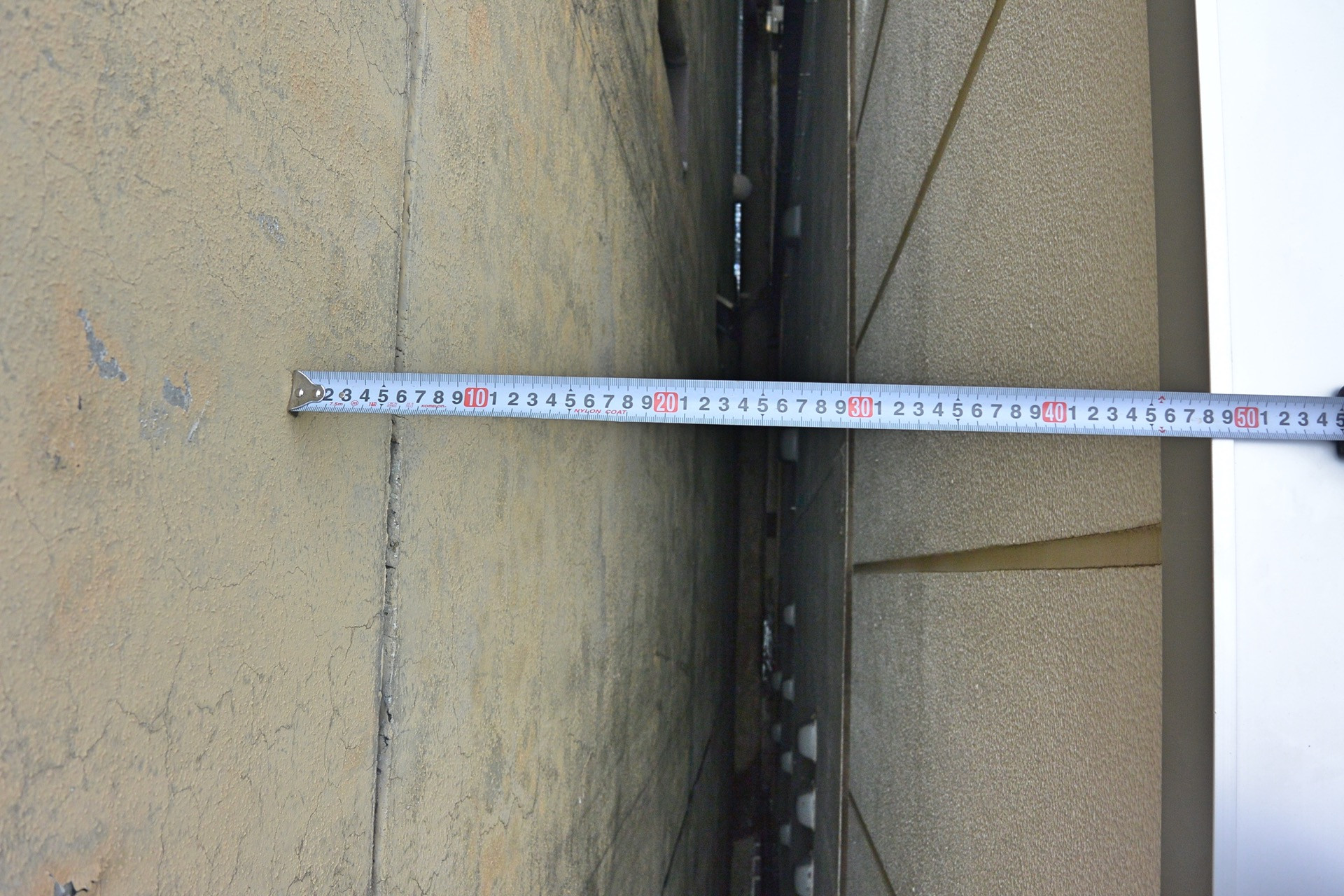 人が入れても、作業するには工具が必要です。工具を適切に使うためにある程度のスペースが必要になります。また、シーリングや塗装など、外壁補修では乾くまで触れれない工事が多く、狭い場所で、強引に工事を進めると不具合がおこる場合もありますので、基本的には実績にもとづき50cmを目安にしております。