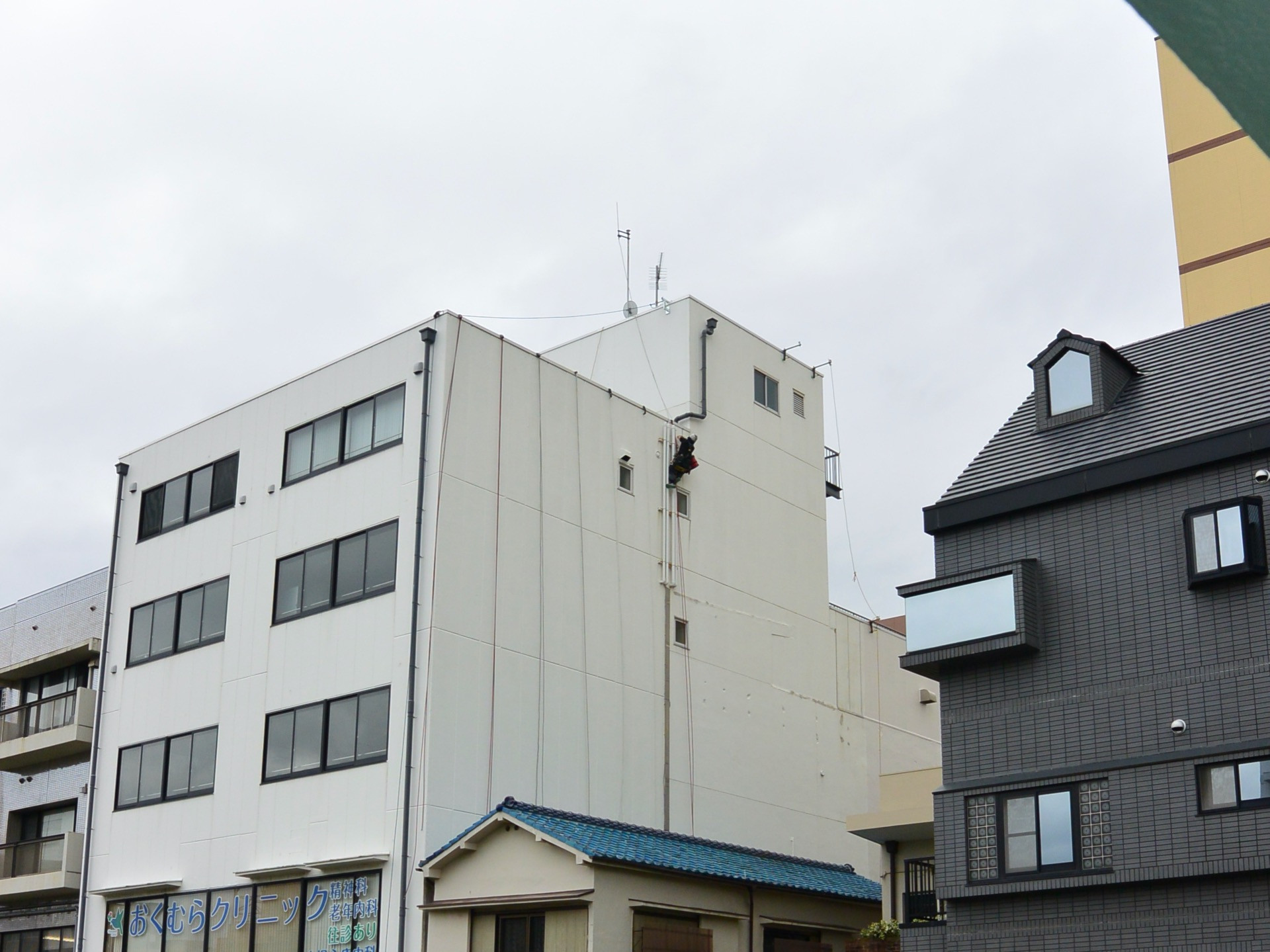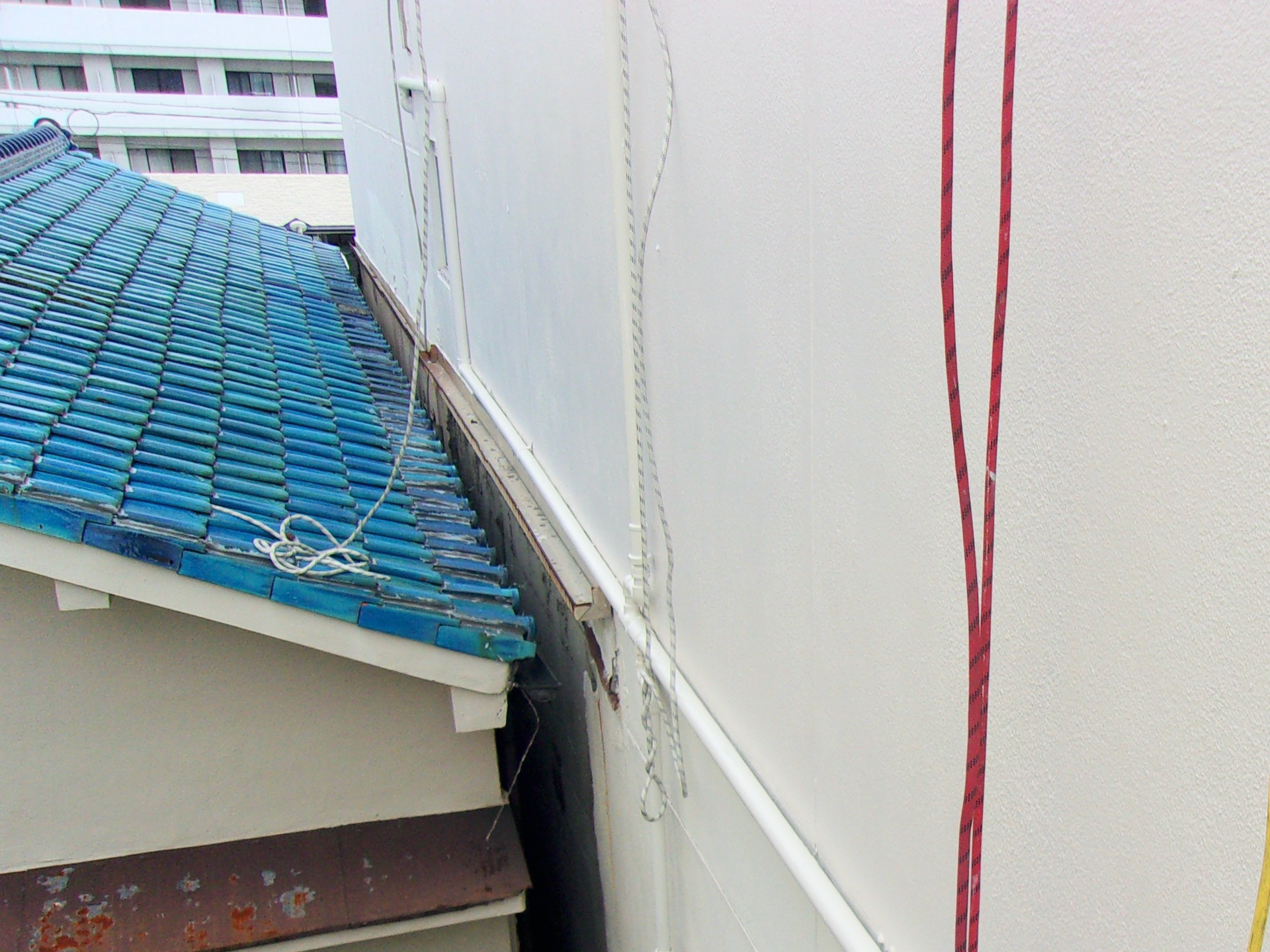 隣と全くくっついてしまっている場所の隣より高い部分はロープで施工が可能です。当然隣家のご理解ご協力が必要になります。ご説明やご協力のお願い、清掃など隣家との事前の打ち合わせも丁寧にいたします。