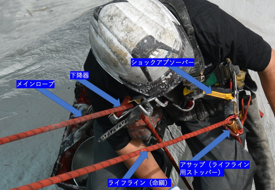 ライフラインは常に体重がかかっているわけではなく、メインロープや下降器に万が一のトラブルが発生した場合、対処する場合の予備ロープですが、命綱になる重要な装備です。アサップはストッパー、ショックアブソーバーは体にダイレクトに衝撃がかかるのを緩和するための装備になります。