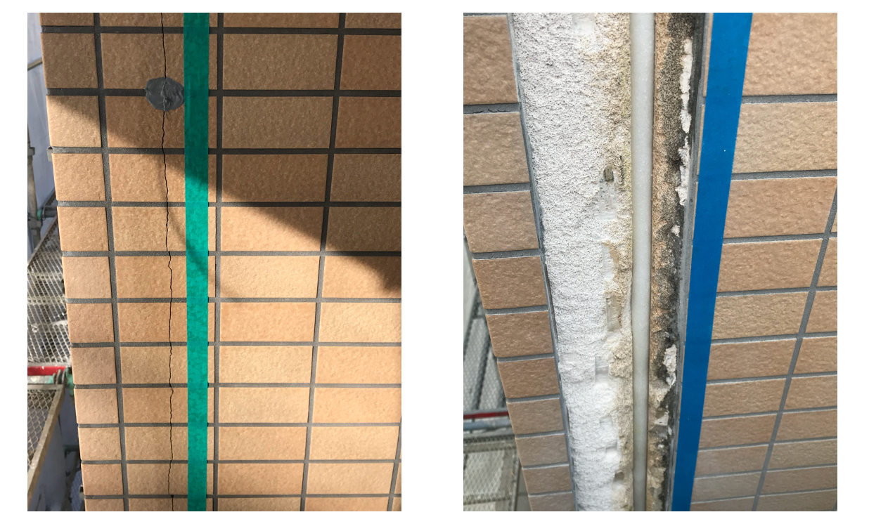 写真はまさに、角部のALC緩衝目地上にまたぐように貼られたタイルに連続した縦筋のクラックが入っています。ALCパネルの動きに追従できず割れてきたものです。タイルの浮きはまだ出ていませんでしたが、クラックより雨水が侵入します。エフロが出たり、ALCパネルが浸水したり、ALC緩衝目地自体が劣化しているとさらにその目地の裏まで雨水が侵入していきます。タイルを貼り替えても最初の恐れが高い部分になります。最初の可能性があるので、大規模修繕の時期がまだ先の場合、貼り替えずに撥水塗装(クラックが微細な場合)やシーリングの刷り込みなどの応急処置でも、雨漏り予防のためには処置をしておいたほうがいいです。雨水の侵入により今は浮いていなくても、他タイルよりは剥落の可能性もいずれ上がってきます。