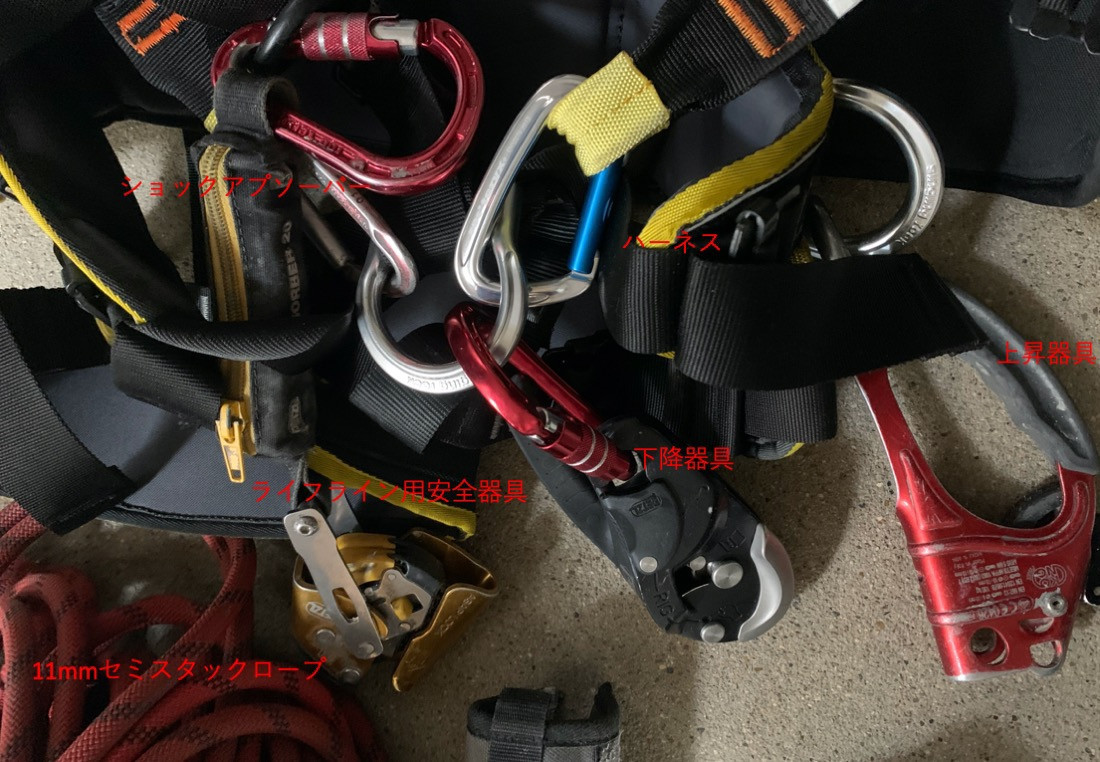 また、登山用、クライミング用のロープは、懸垂下降と違い、通常は体重をかけません。万が一滑落した場合の命綱ですので、滑落したときにショックがダイレクトにかからないよう、オーバーに言えばゴムのように伸びます。手で引っ張ったくらいではそんなに伸びませんが、全体重がかかるとかなり伸びます。一方穂高外装メンテナンスLLC.で使用するのは懸垂下降がメインになりますので、常に体重がかかった状態です。伸び縮みが大きいと作業しにくいばかりか、ロープの寿命も短くなっていまします。命綱であるライフラインに取り付ける器具にショックアブソーバーを付けて、ロープ自体は伸び率が低いものを使用します。
