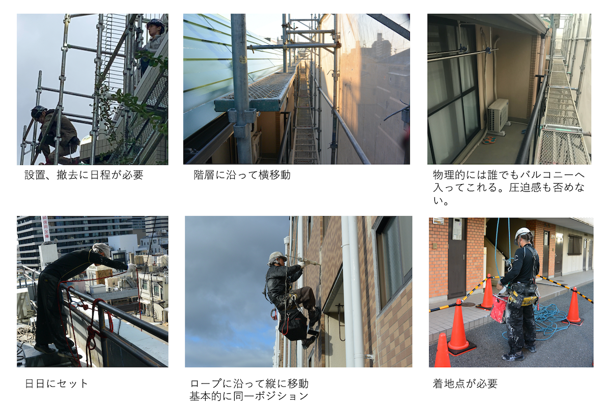 施工中の防犯に関しては、ロープは上記のように日日で引き上げますので、作業員がいなければバルコニーなどはもちろん、通常で侵入できないところへは侵入できません。足場も施錠、防犯カメラ設置など対策は取ることは可能ですが、物理的に侵入を防ぐという点に関してはロープに軍配が上がります。