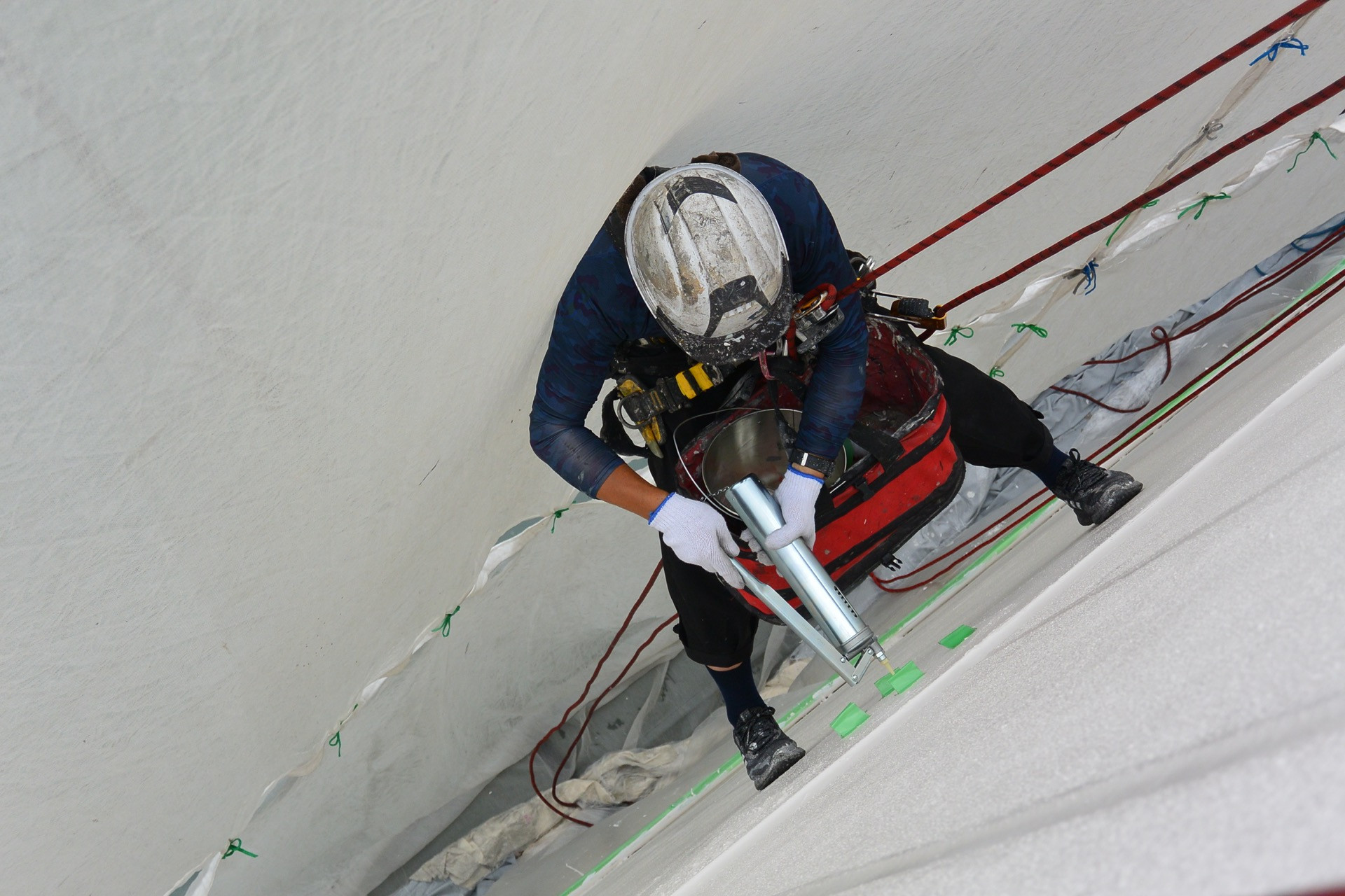 A:施行中に間近で施工内容を確認いただこうと思うと、私たちと同様にロープで降りてもらうしかないので、現実問題としてできません。ただ、いつも思うのですが、足場だったらみに行くのでしょうか。いざとなったら見にいけるから手抜きへの抑止力にはなるかもしれませんが、それはなにも遠くからでもいい気もします。途中経過が気になるのであれば写真を撮ってきます。