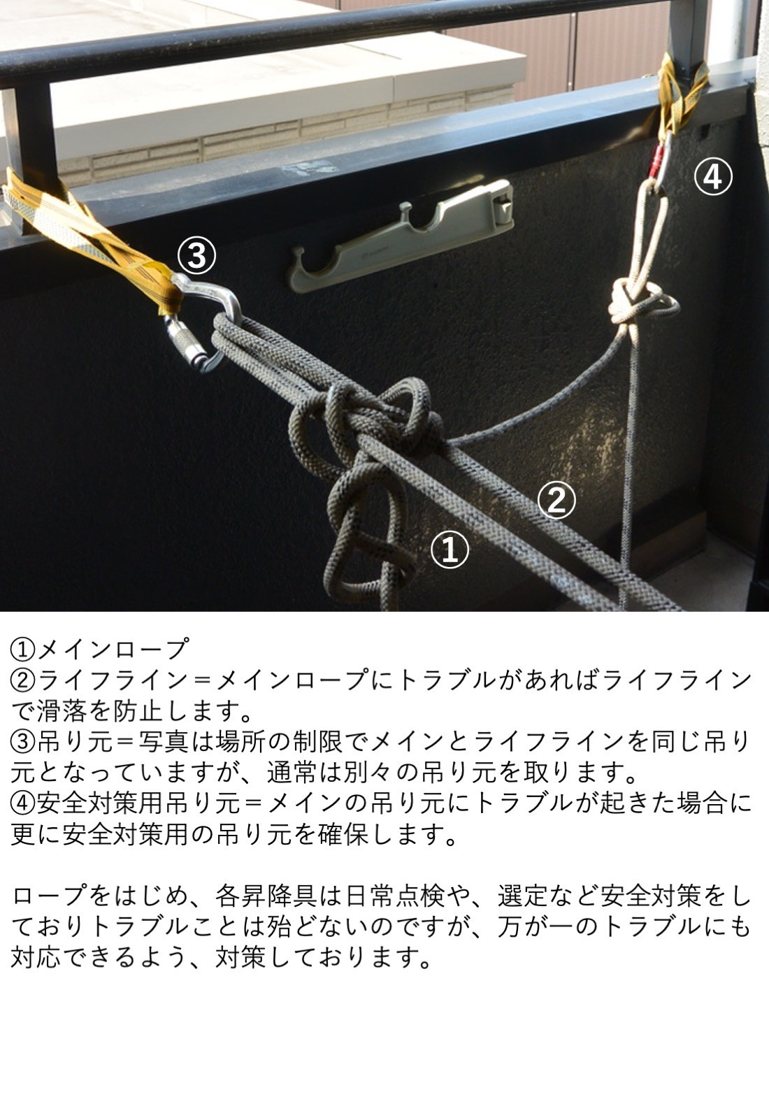 ロープ工法(ブランコ工法)では各部に対し安全対策を施しております