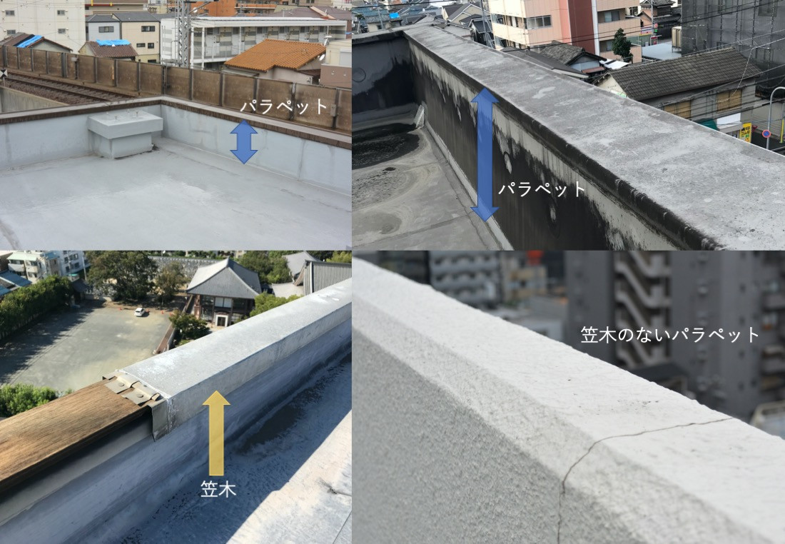笠木はパラペットの天部に被せてあるカバーですが、パラペット自体にもまして、劣化しやすい部位になりますので、日常の劣化状況の確認などはパラペット全体と合わせ、特に注意して観察していただきたい箇所になります。