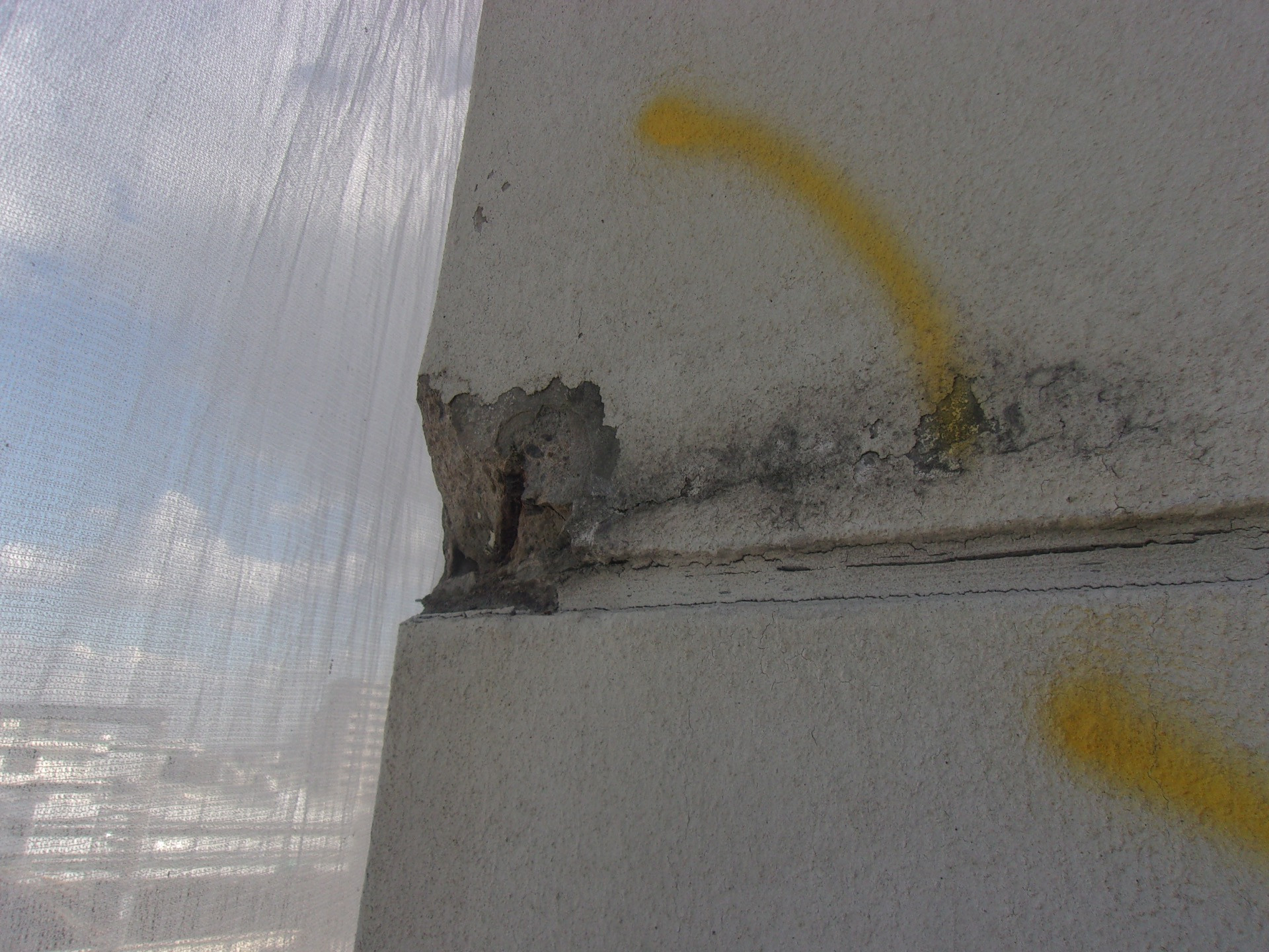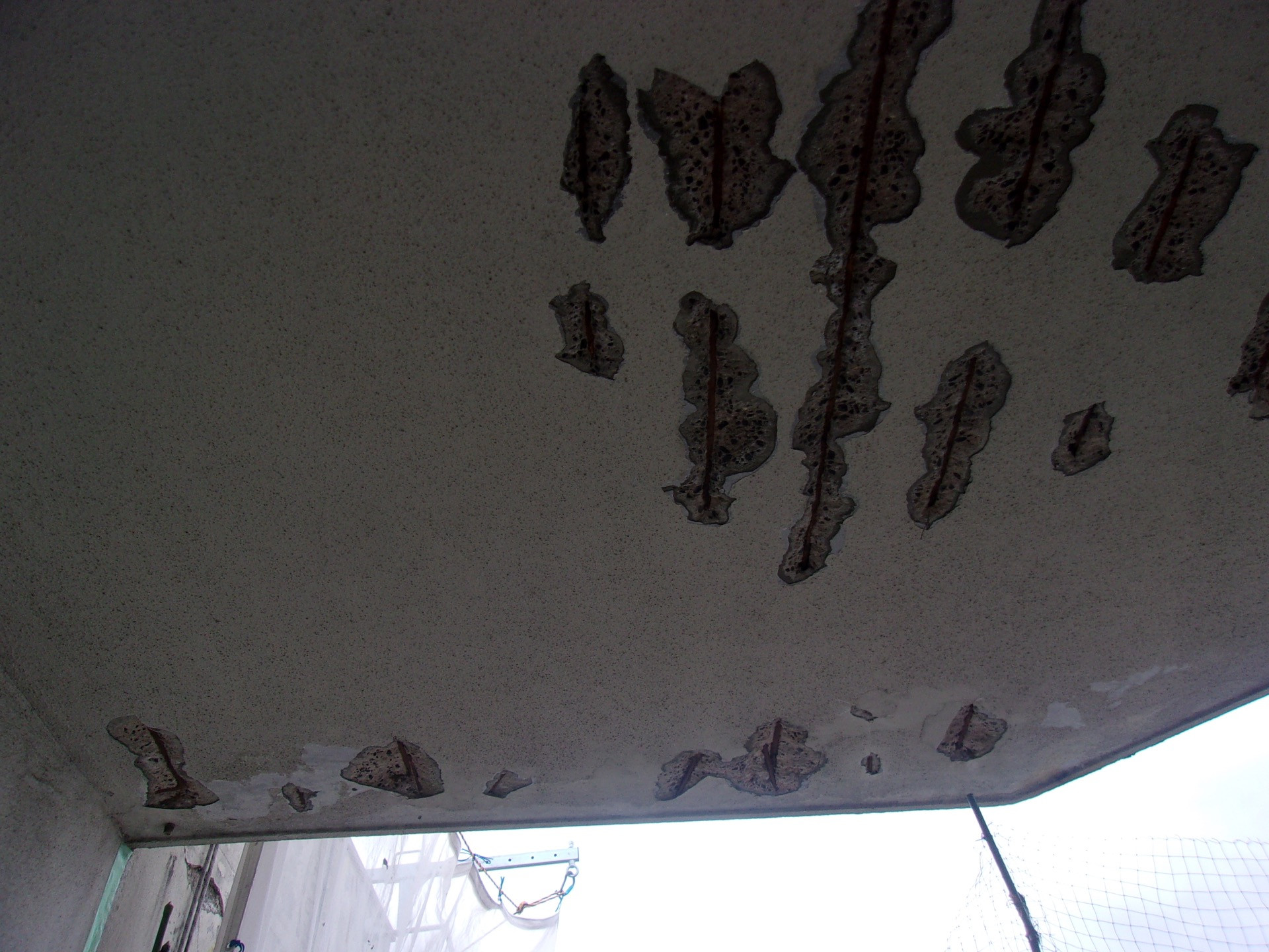 打放しのコンクリートでもクリア塗装や浸透性の撥水剤などを塗布することで塗膜を形成し、コンクリートに直接大気や雨水が当たらなくなり、中性化を防いだり、進行を低減するのです。クラックや塗膜の劣化で直接コンクリートに大気や雨水があたるようになるとその部分はやはり劣化が進みやすくなります。クラックは建物のムーブメント(動き)で発生します。クラックから入り込んだ炭酸ガスや雨水がクラック内及び周辺の中性化を助長し、鉄筋に錆が発生して爆裂に至ります。爆裂してしまえば更なる錆の進行を抑えるため錆止めの塗布、シーリング処置、モルタル打設などの処置が必要です。外壁塗装はコンクリート中性化する速度を遅くしますが、爆裂の補修にはなりません。
