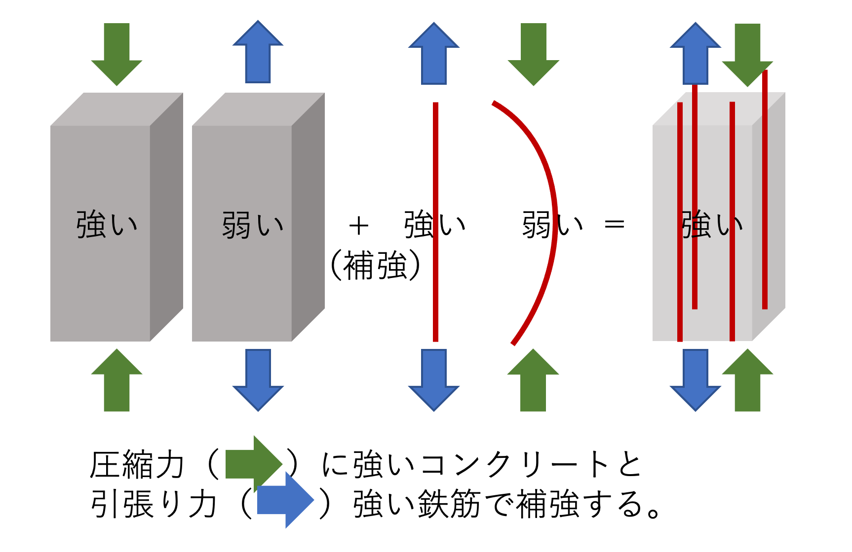 ・コンクリートの弱さである引張りへの弱さを補強するために鉄筋を使用。