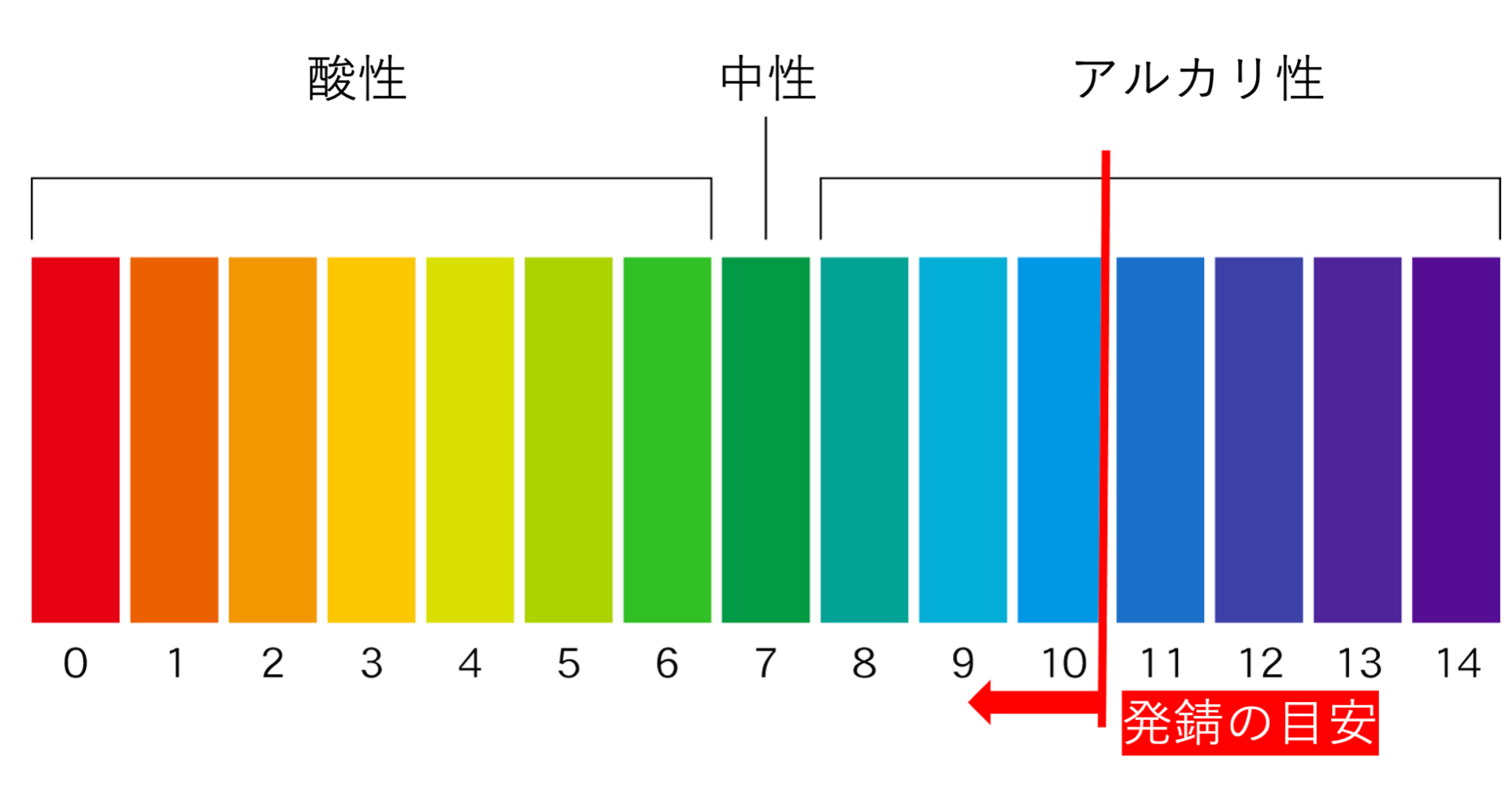 アルカリ性、酸性を表すのにpHという単位があり、リトマス試験紙でわかるアルカリ性、酸性と同じです。コンクリートの場合表面だけで判断することができませんから、表面にリトマス試験紙を押し当てて中性化が進んでますね、、と、判断することはできません。炭酸化は表面から内部へ拡散します。しかし、その境界が明確なわけではありません。pHは0から14までで表されます。14が強アルカリで数値が下がるほど酸性に向かいます。一般的にコンクリートはpH13くらいから徐々にアルカリ性を失っていきます。