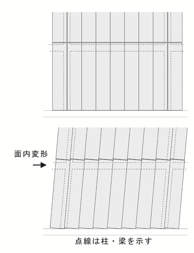 ALCはパネルにして外壁に使用する場合が殆どです。定寸のパネルをメインに、様々に寸法に加工されたものを合わせ面を構成していきます。写真のように目地が多くなります。この目地に振動などのムーブメントを逃がせるのが特性になります。目地のシーリングは防水はもちろんですが、ムーブメントを逃したものを緩衝する役割も担っています。地震や大きい振動に対してもそうですが、熱膨張や、微細な振動も逃す役割があります。もちろん、微細な振動が積み重なってもすぐに劣化する訳ではありませんが、角部や2〜3階部分など、動きが逃げてきやすい部分は先にいたんで来ることが、動きを逃す観点だけでいうと、動きが大きくなる分他の外壁の建物より意識を持っておく方が良いと思います。