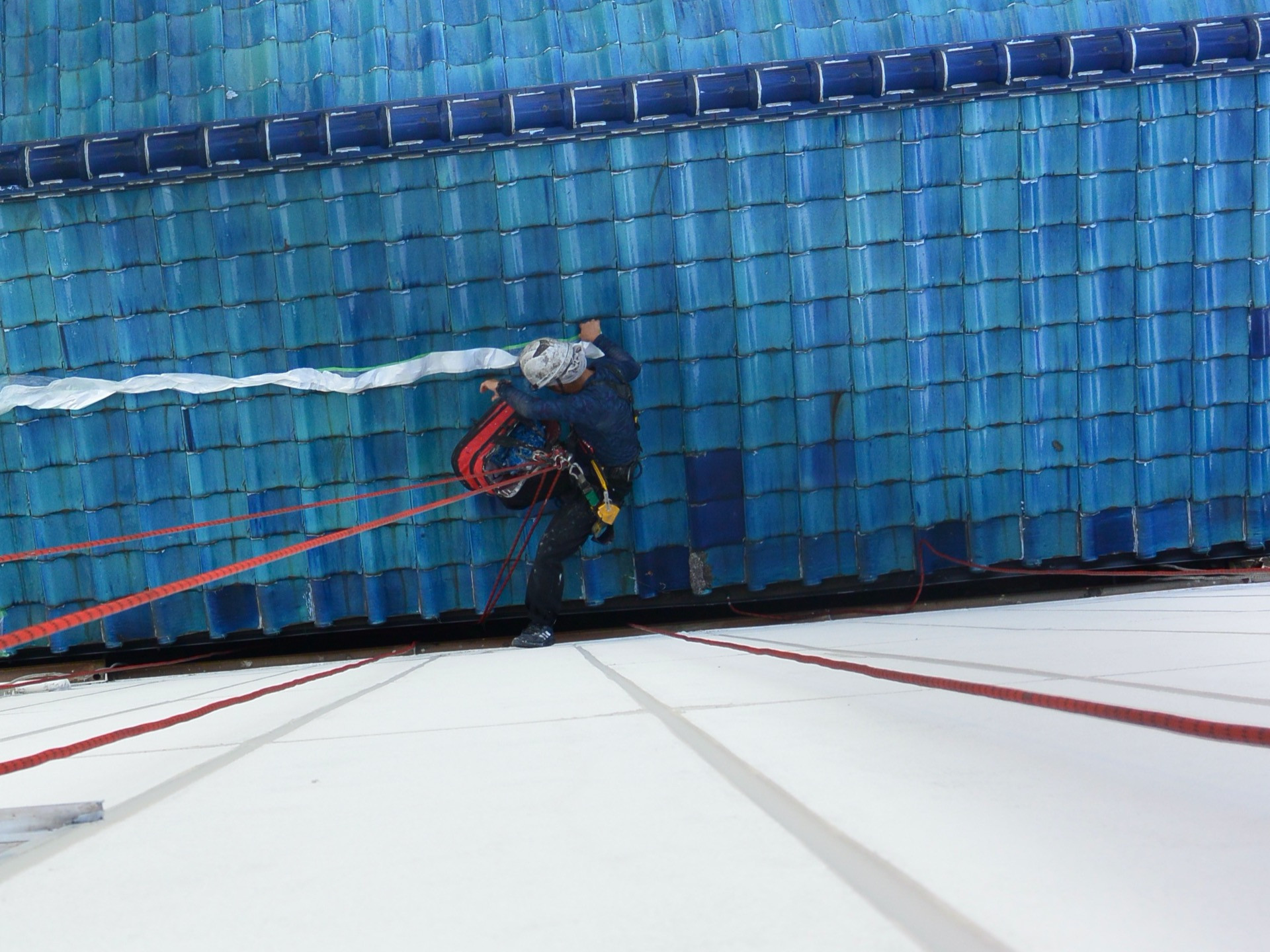 ただ、特記しておきたいのは、ロープを使った無足場特殊工法は、工事を施工するための手法であるということです。ロープ作業は特殊な技術が必要です。ロープで降下することだけでなく、ロープ作業独自の作業手順、状況判断、安全確保など、降りる技術だけをマスターすれば良いものではありません。ただ、これらの技術は施工する前提条件でしかありません。足場を使わない代わりにロープを使うだけのことです。