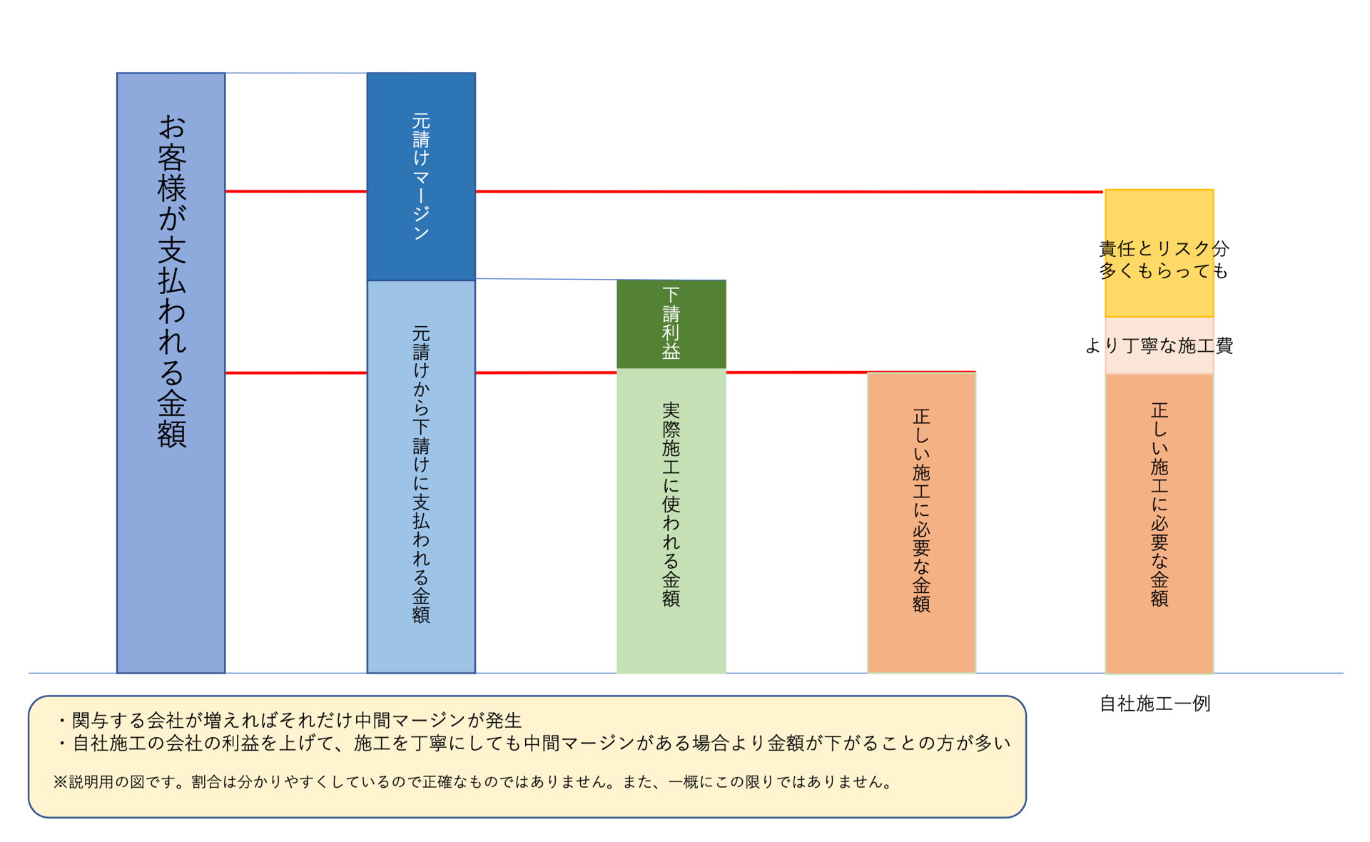 もちろん中間マージンを否定するわけではありません。各社がそれぞれに責任とリスクがついて回りますし、利益を上げなければ経営が成り立たないのは自社施工の会社も同様です。大手元請けになれば信用もできるでしょう。お客様も窓口を見つけやすく便利です。