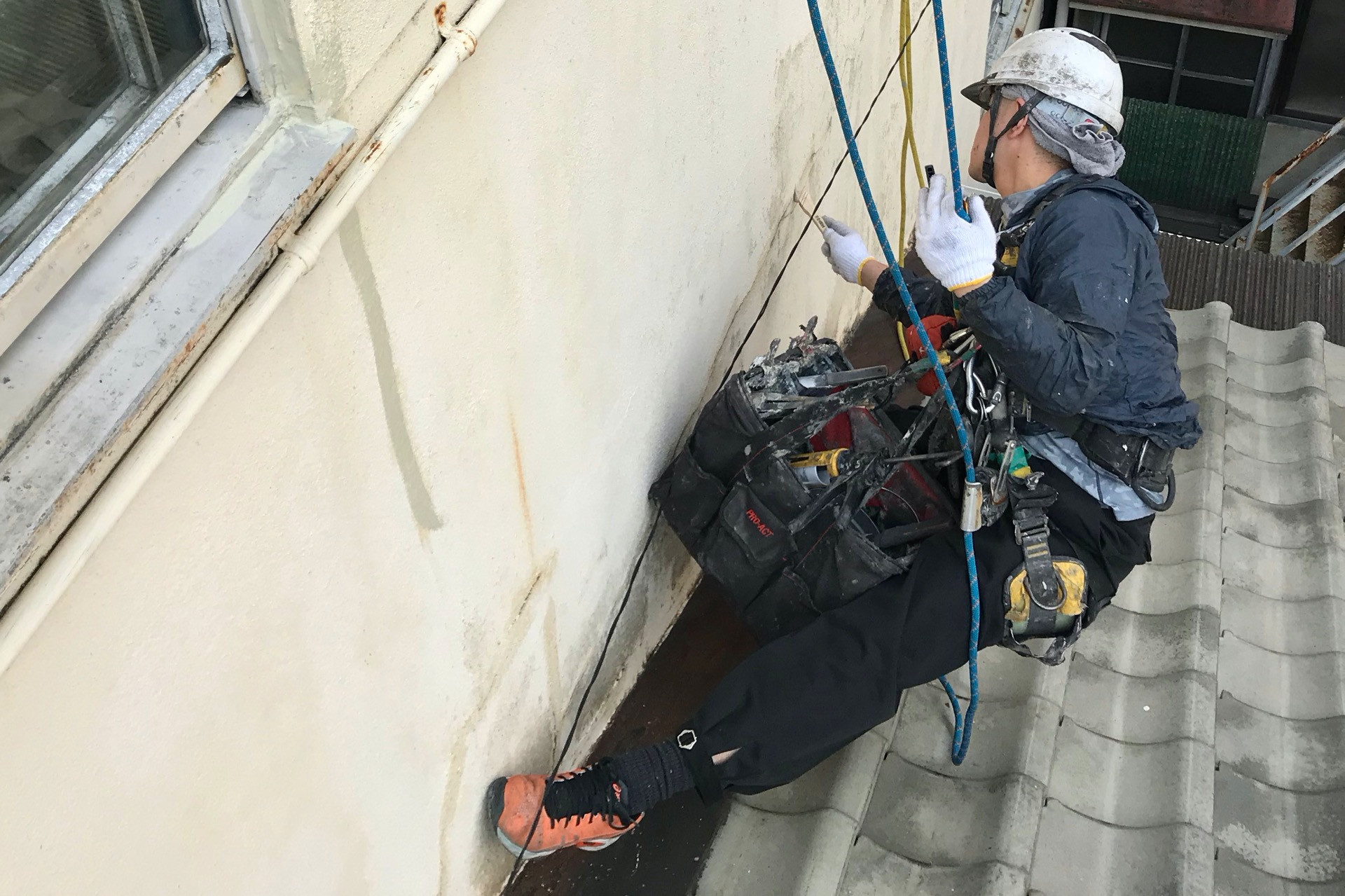 大阪府東大阪に本社を置く穂高外装メンテナンスLLC.は、雨漏り補修などの部分補修から建物全体の補修まで、ロープアクセスだからこそできる、お客さまの立場にたった提案と丁寧な施工で多くのお客様にご支持をいただいております。穂高外装メンテナンスLLC.が得意とするロープアクセスの最大のメリットは、足場の架設を待たずに、いつでもすぐに外壁などの高所部分の確認、補修ができること。また仮設日程を気にしなくてよく最後まで丁寧な工事に集中できること、足場の架設ができない隣との隙間場所での施工など、状況に合わせて施工プランをご提案できる工法です。