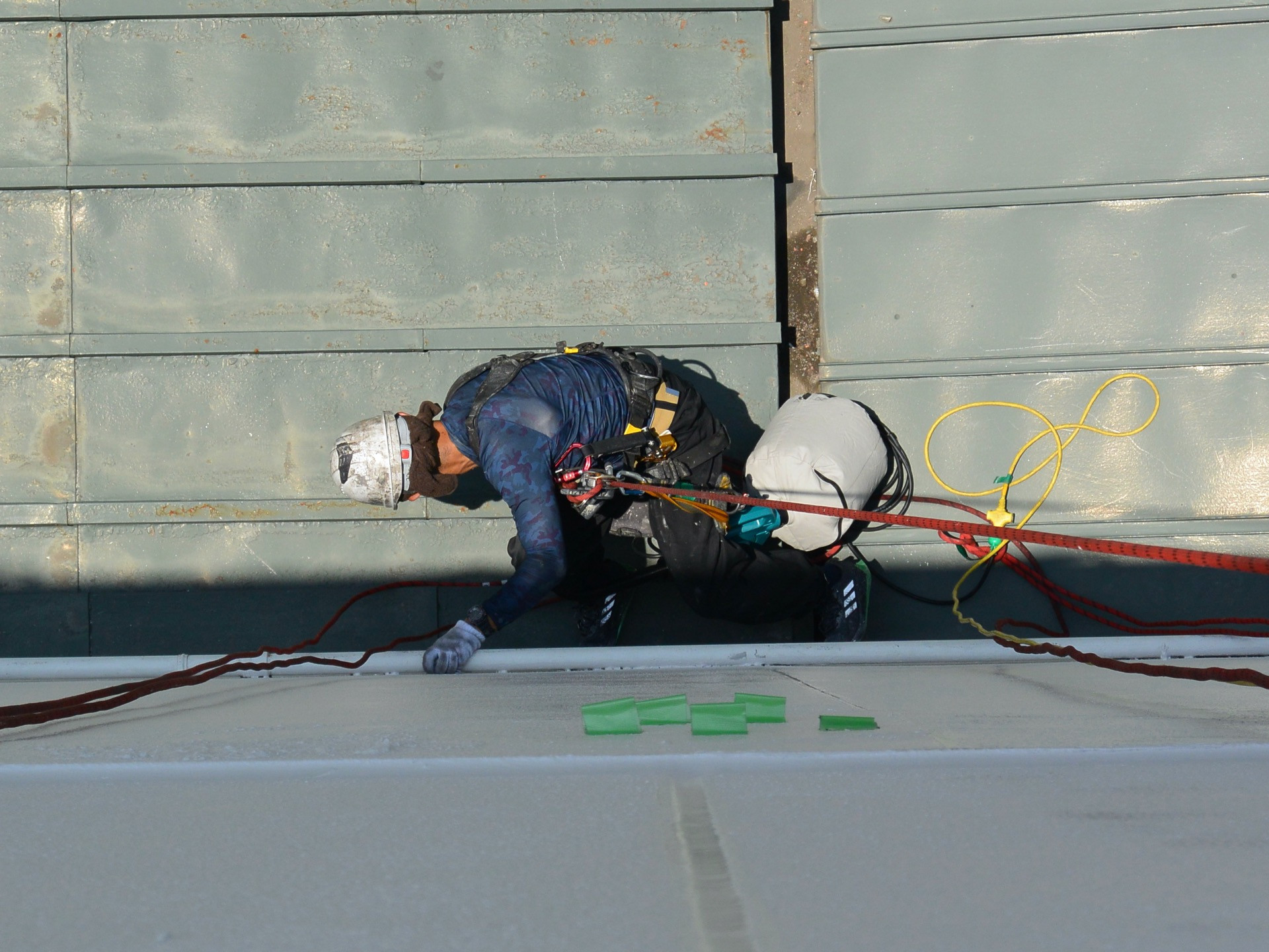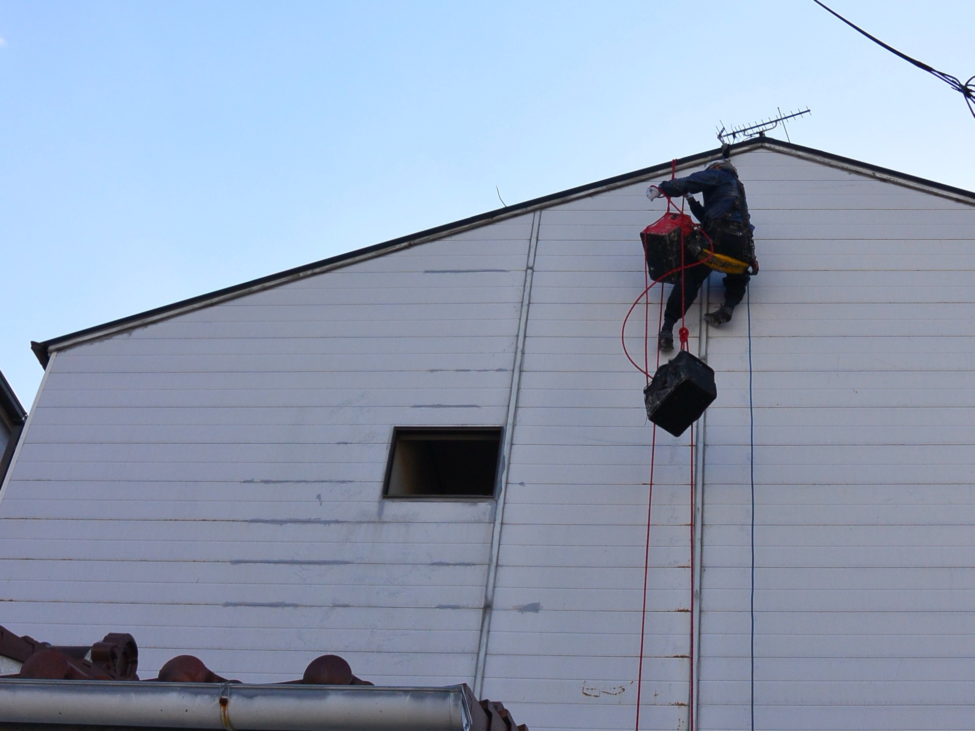 ロープを使ったロープアクセスは、ブランコ工法や無足場工法などとも呼ばれますが、近年ではロープアクセスという呼称が一般化されつつあります。高所作業の手法で、屋上からロープをおろして作業します。なので、まずは前提として屋上に上がれることが必携になります。屋上にワッカや手摺りなど、丈夫な吊り元があればより良いのですが、もし吊り元が無く(無さそう)でも、専用器具などで、施工できる場合もあります。また、基本的に着地点も必要です。着地できない場合は登り返したり、複数のロープの横移動なども可能です。吊り元や着地については、工事内容などによっても変わりますので、屋上に上がれるのであれば、一度ご相談ください。
