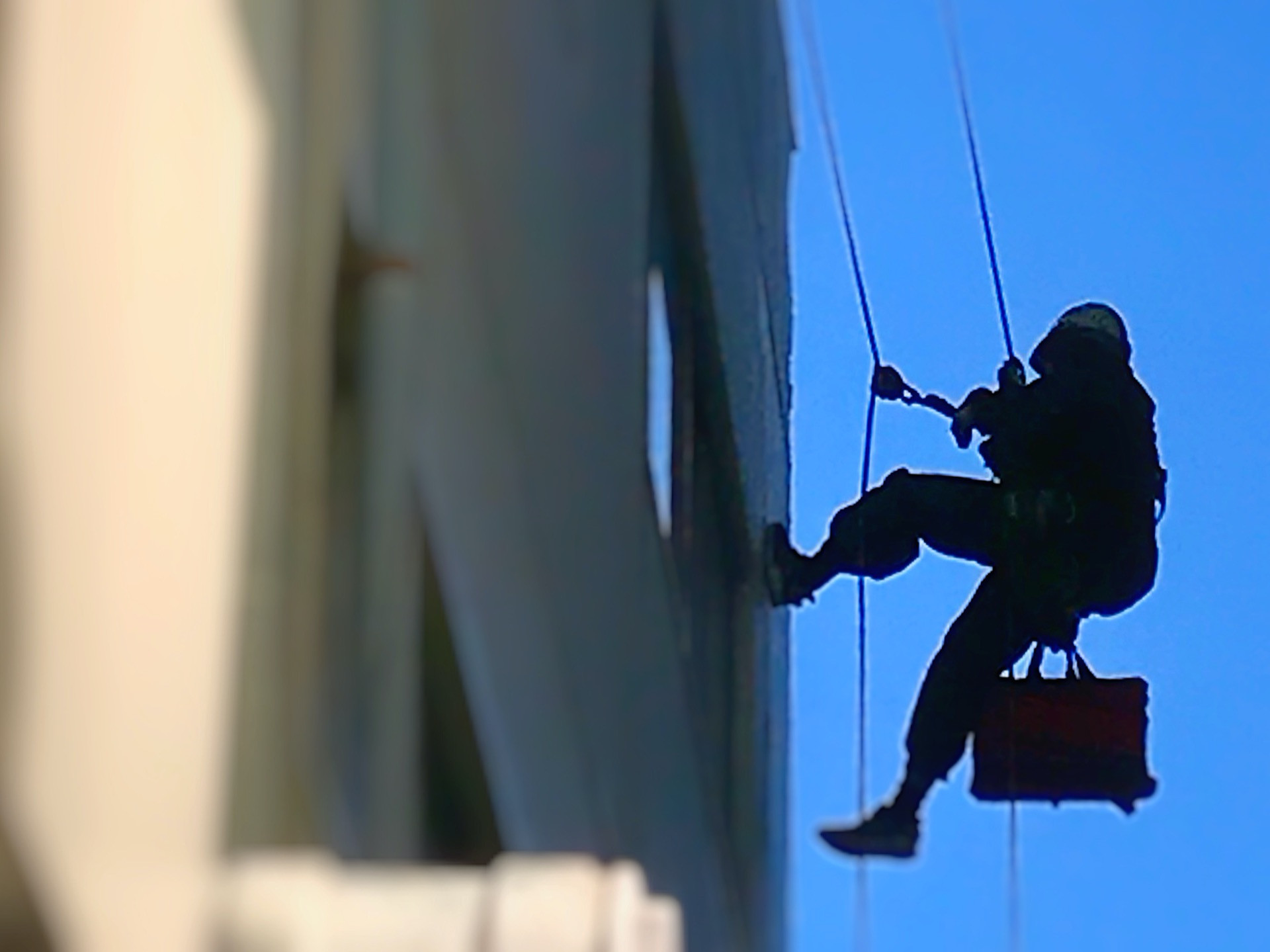 穂高外装メンテナンスLLC.の職人はロープワークのなかでも難易度がある施工も丁寧に施工いたします。